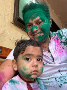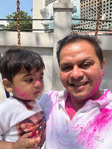 Reflecting on the timeless debate between gulal and water colors, he says, “As kids, we were warriors—filling water balloons at 6 a.m., planning ambushes with friends. Today, I prefer gulal. It’s cleaner, softer on the skin, and still carries the joy of celebration.”