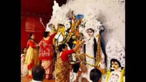 Indore (Madhya Pradesh): बंगाली स्कूल एंड क्लब परिसर में गुरुवार सुबह उस समय सबकी आँखों में नमी और गले भर आये जब महिलाओ ने पारम्परिक वेशभूषा पहनकर एक दूसरे को सिंदूर लगाकर देवी दुर्गा माँ को बिदाई दी।