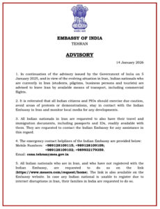 दूतावास ने आपातकालीन संपर्क हेल्पलाइन भी जारी की हैं। मोबाइल नंबर: +989128109115; +989128109109; +989128109102; +989932179359। ईमेल: cons.tehran@mea.gov.in