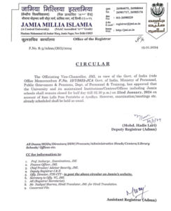 नई दिल्ली। दिल्ली की जामिया मिल्लिया इस्लामिया यूनिवर्सिटी को लेकर एक बड़ी खबर सामने आ रही है। दरअसल अयोध्या में 22 जनवरी को राम मंदिर की प्राण प्रतिष्ठा को लेकर पूरे देश में हर्ष का माहौल है। इसी बीच जामिया मिल्लिया इस्लामिया यूनिवर्सिटी ने रामलला की प्राण प्रतिष्ठा के मौके पर हॉफ डे का निर्णय लिया है। इस संबंध में विश्वविद्यालय की तरफ से नोटिफिकेशन भी जारी कर दिया गया है। बता दें कि इससे पहले मोदी सरकार ने 22 जनवरी को अयोध्या में राम मंदिर प्राण प्रतिष्ठा के मौके पर सभी सरकारी दफ्तरों को आधे दिन बंद करने का फैसला लिया है। बता दें कि विश्वविद्यालय की ओर से जारी किए गए सर्कुलर के मुताबिक, आगामी 22 जनवरी को अयोध्या में प्राण प्रतिष्ठा कार्यक्रम को ध्यान में रखते हुए हाफ डे का ऐलान किया गया है, ताकि सभी लोग इस ऐतिहासिक कार्यक्रम के साक्षी बन सकें। सरकार ने कर्मचारियों की भावनाओं को ध्यान में रखते हुए ऑफिस को दोपहर ढाई बजे तक अवकाश का ऐलान किया। वहीं प्राण प्रतिष्ठा समारोह के दिन कई राज्यों में छुट्टी करने का निर्णय लिया जा चुका है। उत्तर प्रदेश और मध्य प्रदेश में प्राण प्रतिष्ठा के दिन छुट्टी का ऐलान किया है।
